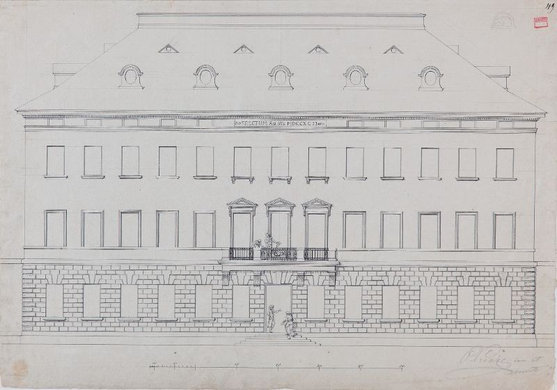 This draft of a palace was made by the architect Peter Joseph Krahe in 1792. I modelled the building after this front plan: