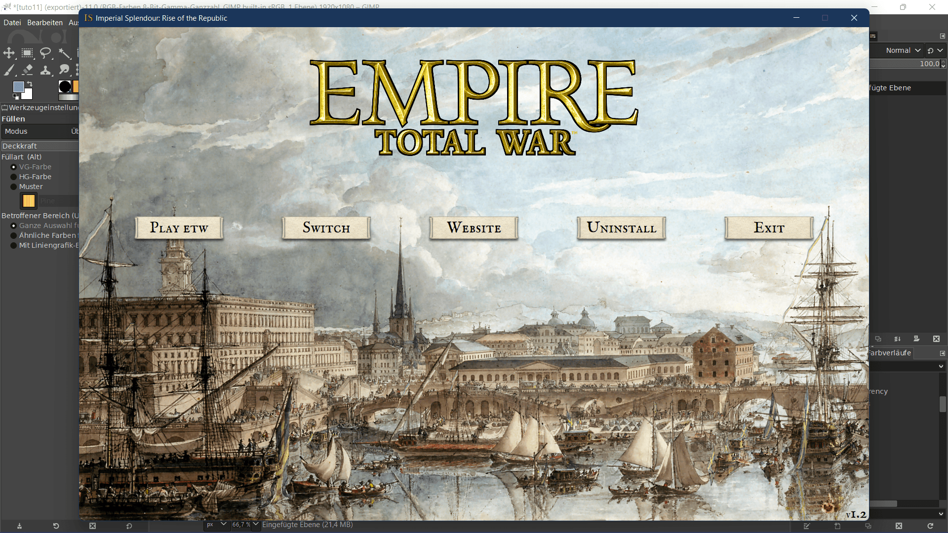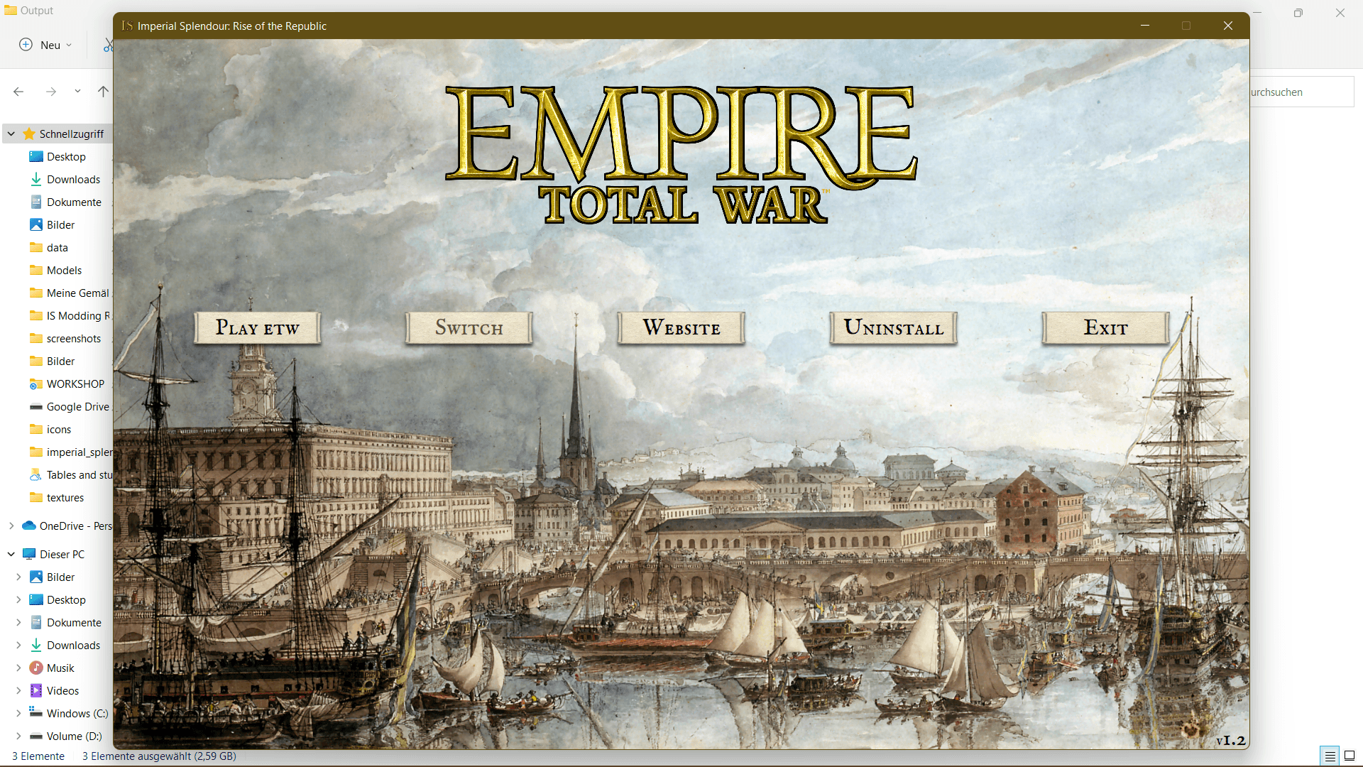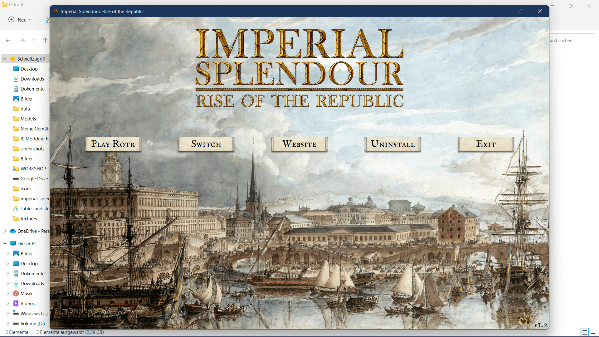 Now the Imperial Splendour launcher opens. You can choose to play vanilla Empire Total War or Rise of the Republic 1.2. Click on 'Switch' to play RotR 1.2. As you can see, the RotR header now appears. If you can see the header you can play RotR 1.2 by clicking on 'Play RotR'.