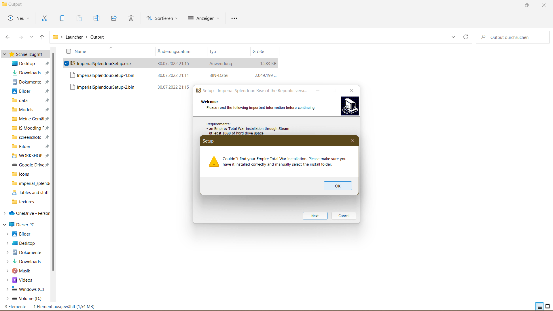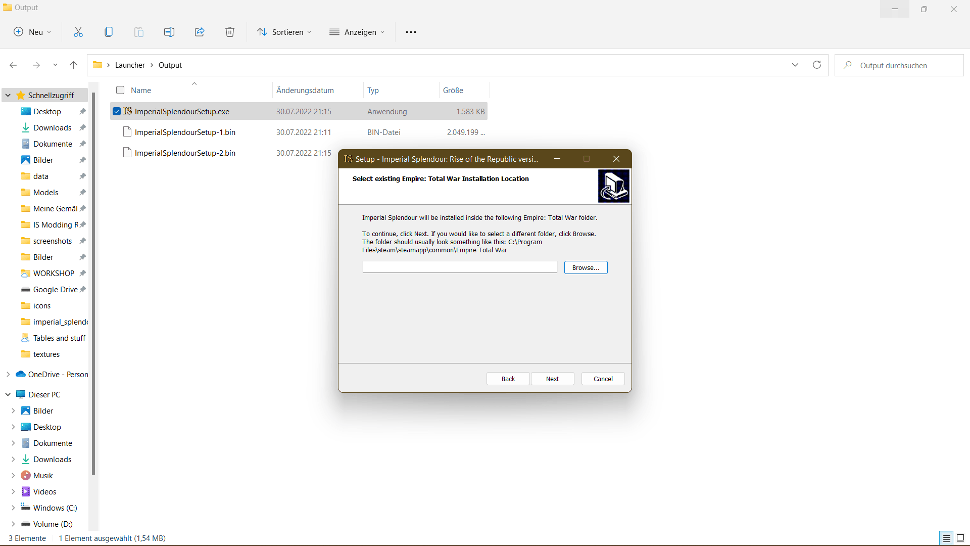 The installer now searches for the standard path to your Empire Total War installation. If you've installed Empire Total War on a custom path like me, the following window pops up.