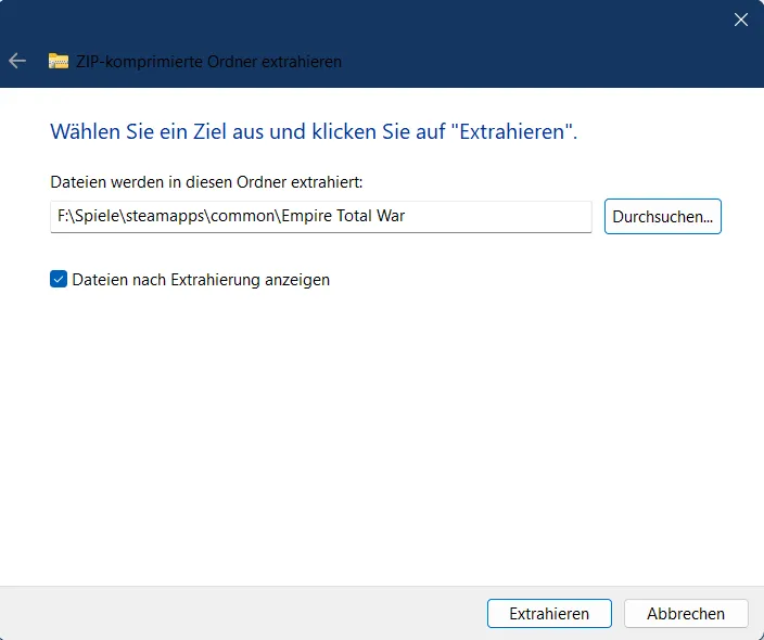Select your Empire Total War folder as the path. The path should have the following ending: …\steamapps\common\Empire Total War.